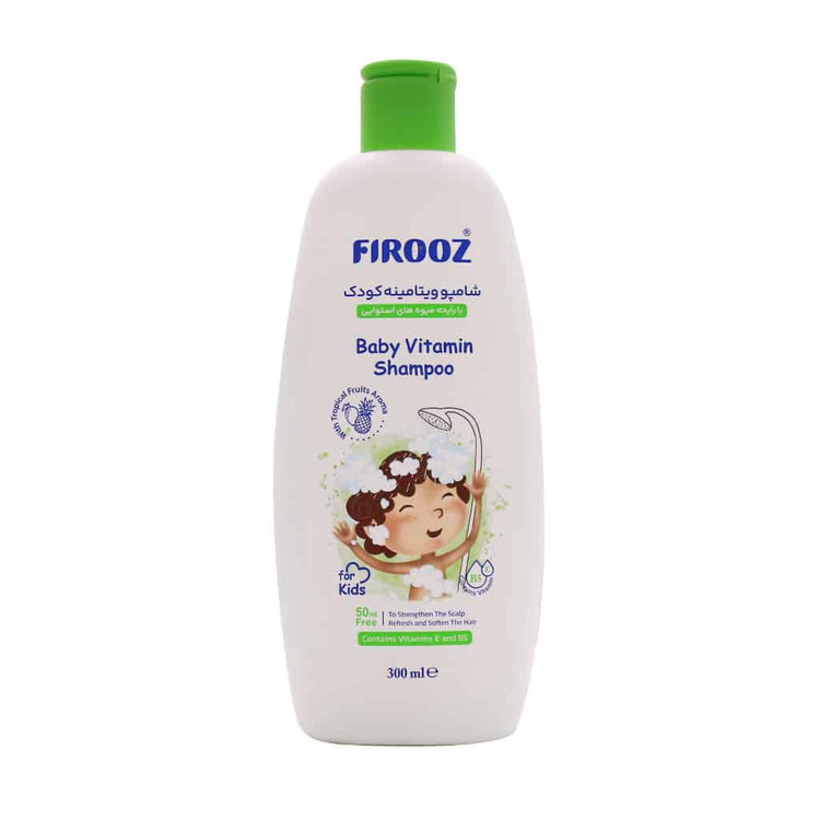 شامپو بچه ویتامینه فیروز شوینده ای ملایم دارای ویتامین E و B5 با خاصیت نگهداری رطوبت طبیعی و تقویت ریشه و کمک به حالت پذیری ساقه مو می باشد، با بوی ملایم و مطبوع و pH خنثی و بدون هرگونه مواد صابونی و الکلی و هر گونه حساسیت زایی است. شامپو بچه ویتامینه فیروز در هنگام شستشو باعث اشک و سوزش چشم نمیشود.